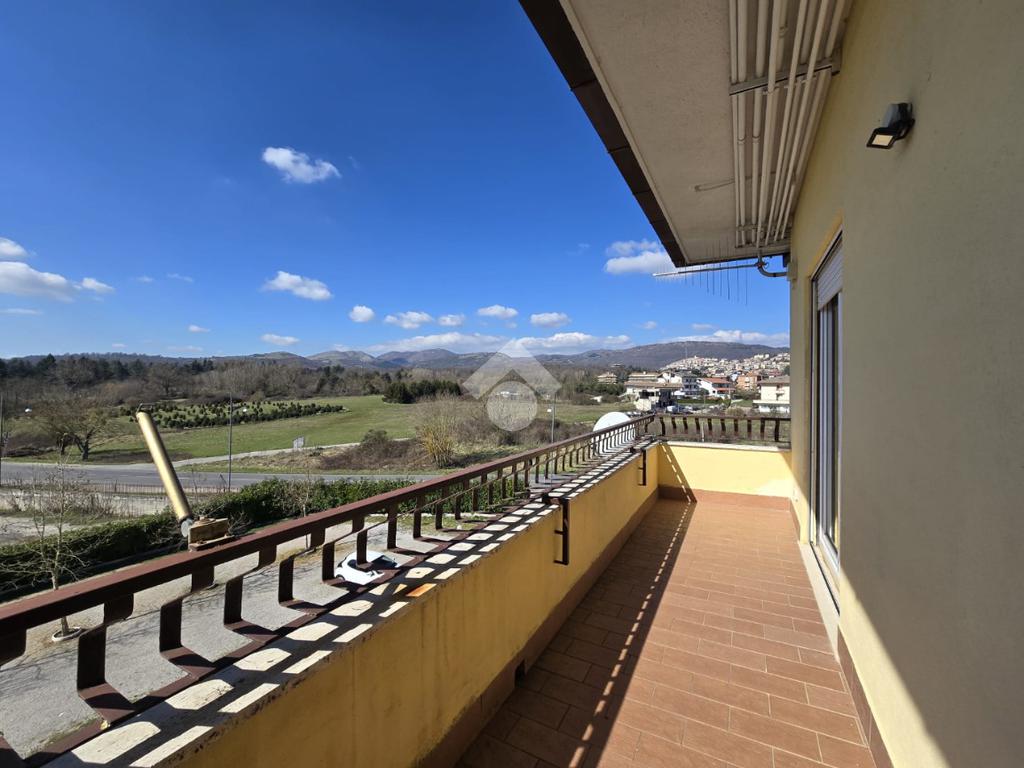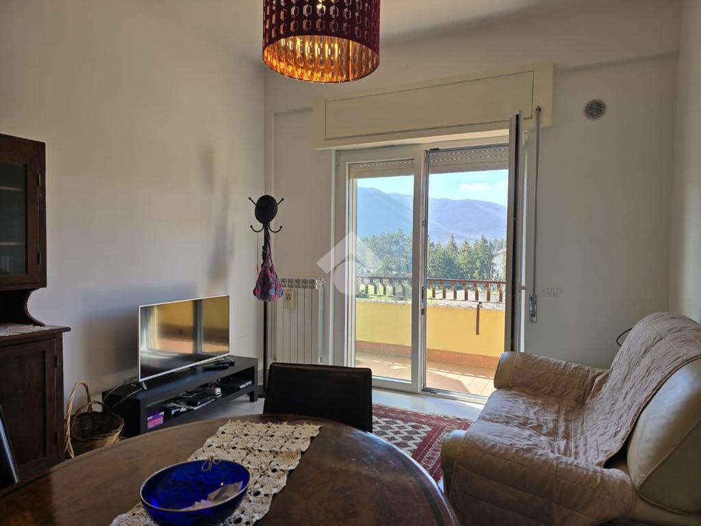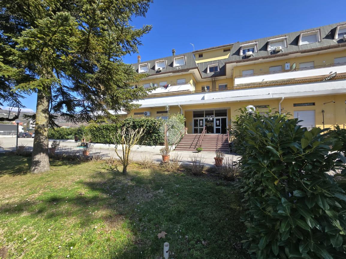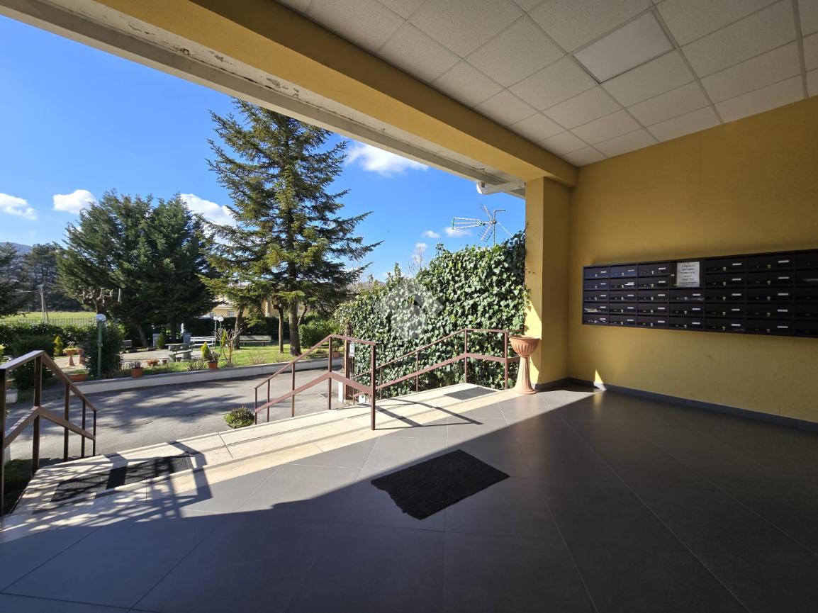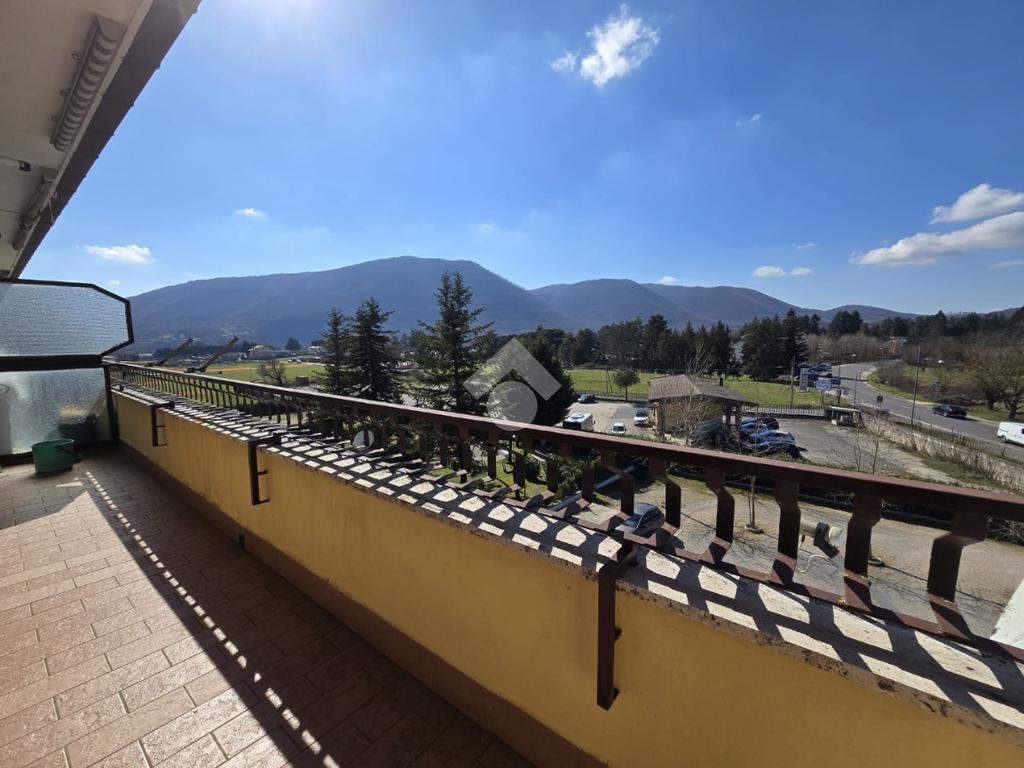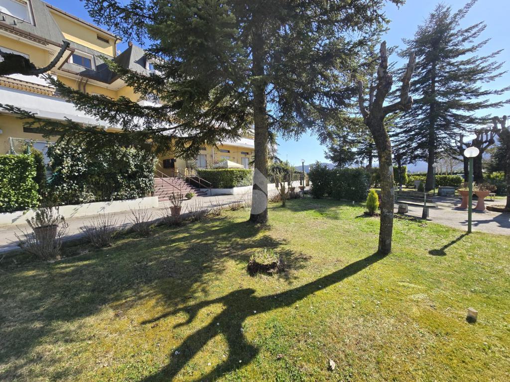 Il vero fiore all'occhiello è il balcone a livello con accesso da entrambi i vani principali , con esposizione sud- ovest; da qui si gode di una vista panoramica aperta e rigenerante sia sul giardino interno condominiale, ben curato ed attrezzato, sia sull'area di parcheggio interna riservata ai condomini e chiusa da cancello pedonale e carrabile, nonchè sul verde delle montagne circostanti.