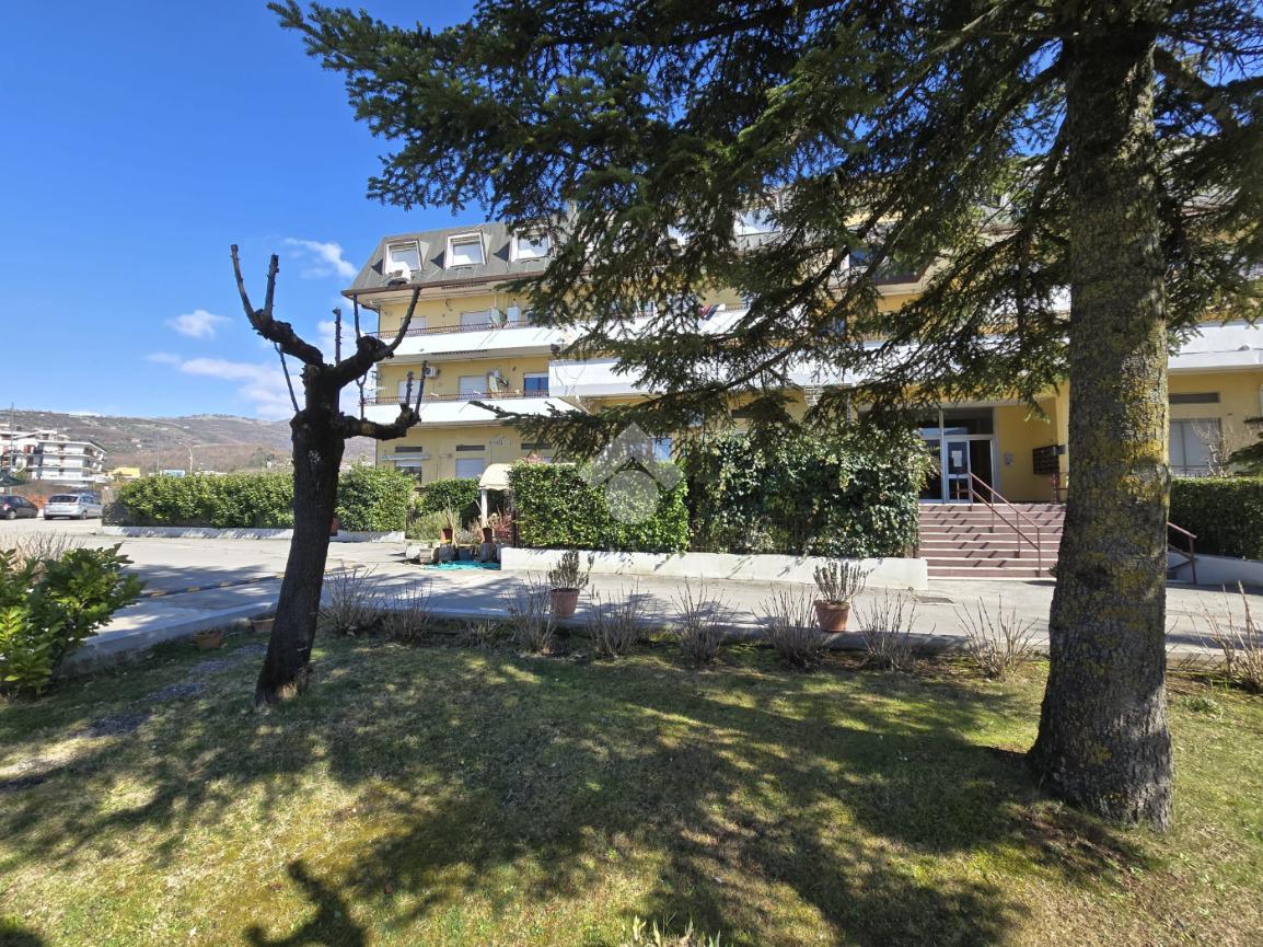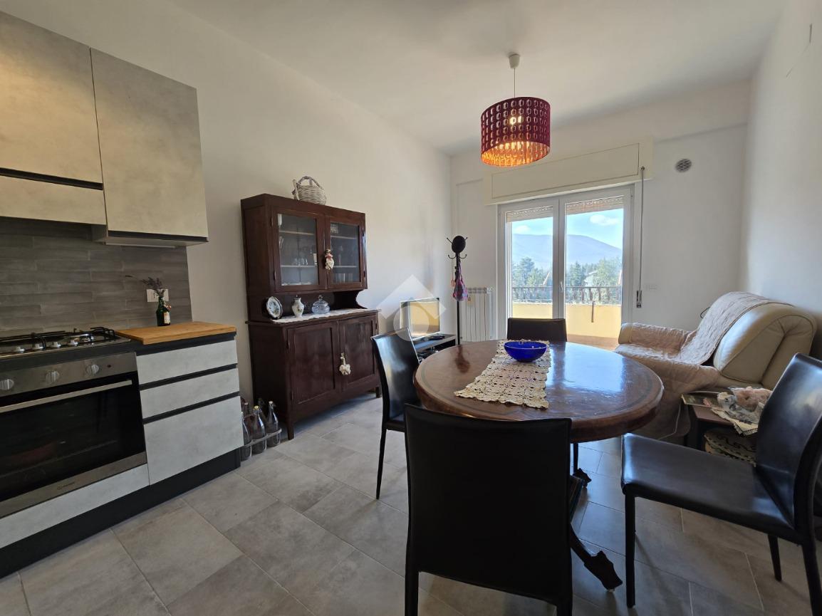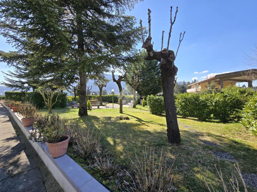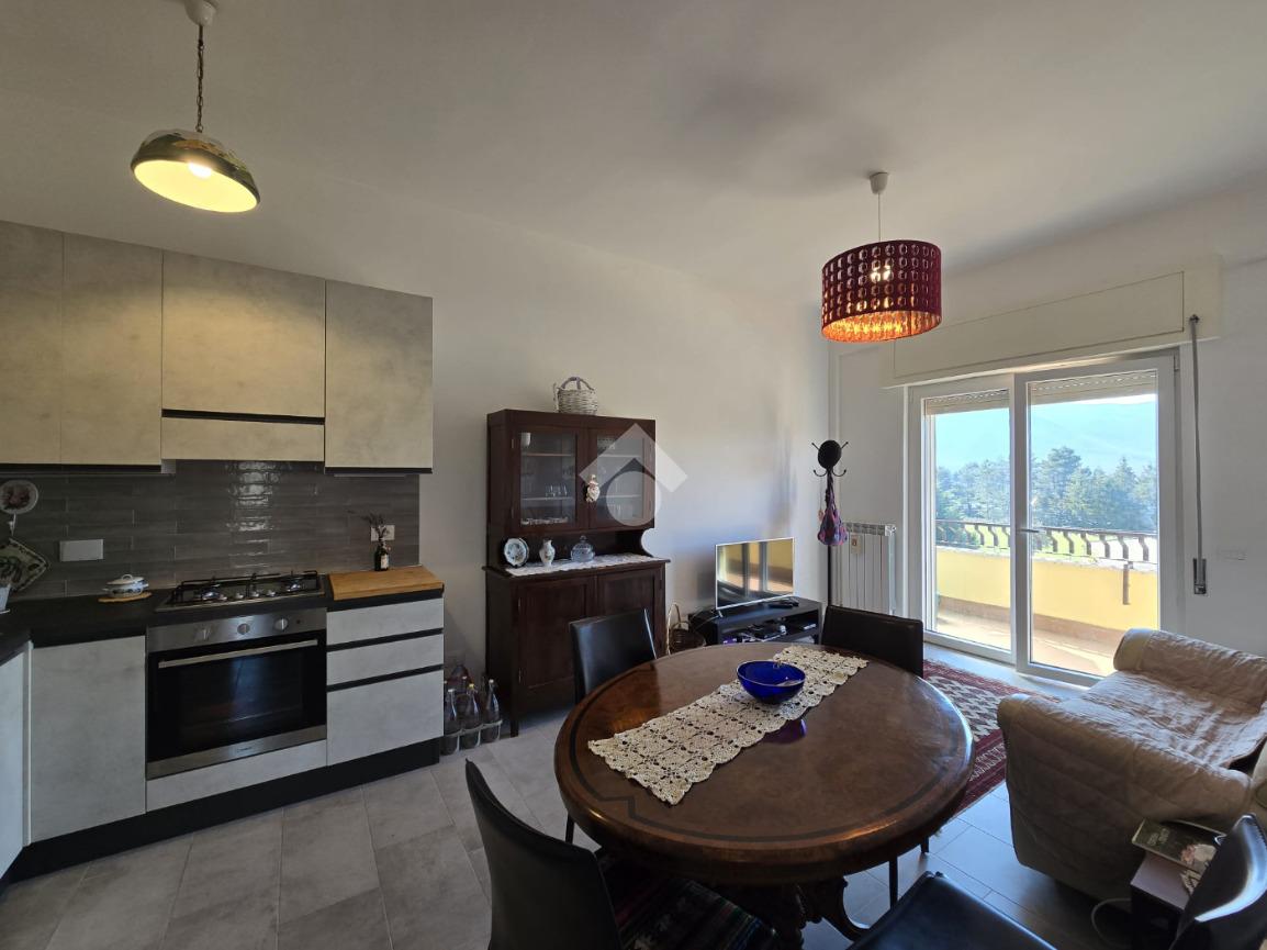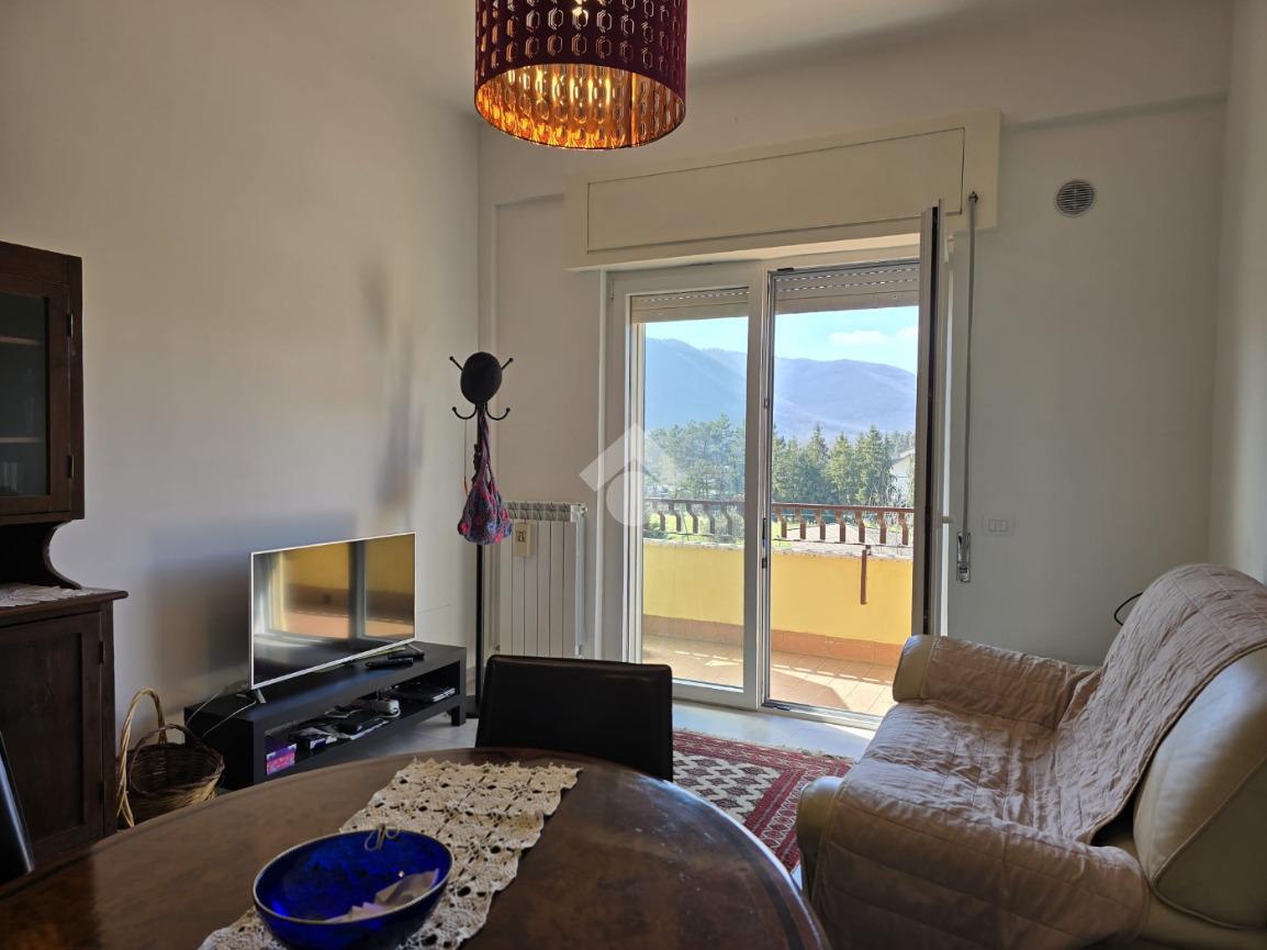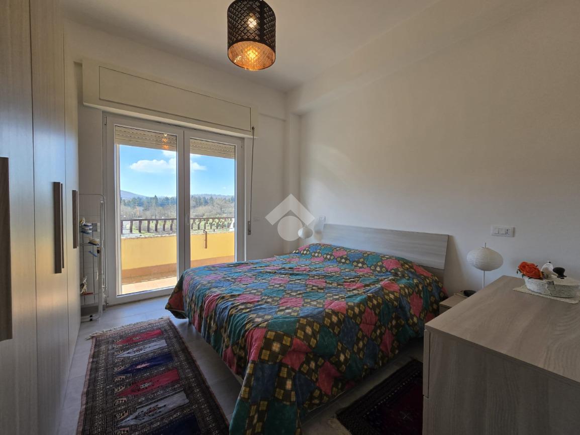 Il vero fiore all'occhiello è il balcone a livello con accesso da entrambi i vani principali , con esposizione sud- ovest; da qui si gode di una vista panoramica aperta e rigenerante sia sul giardino interno condominiale, ben curato ed attrezzato, sia sull'area di parcheggio interna riservata ai condomini e chiusa da cancello pedonale e carrabile, nonchè sul verde delle montagne circostanti.