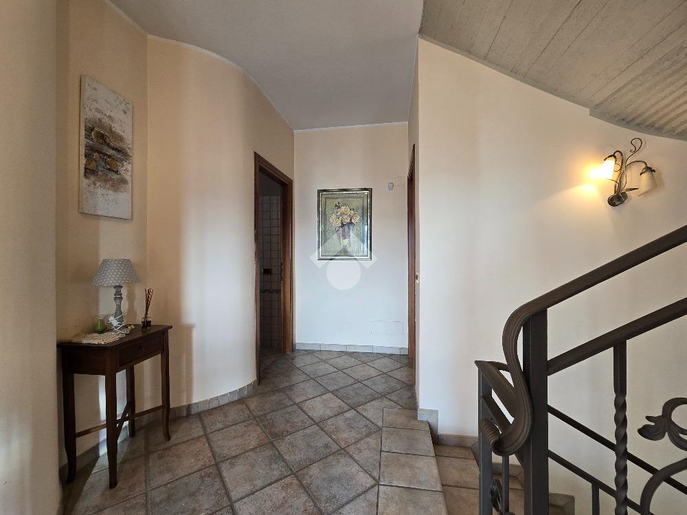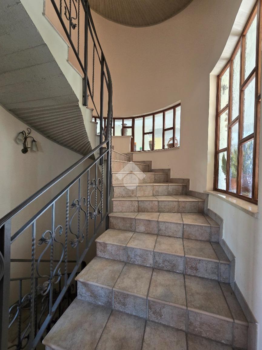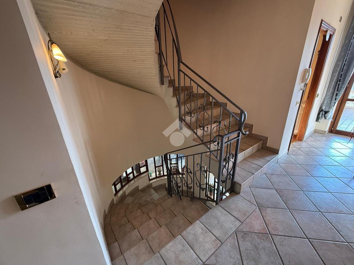 La scala che conduce al piano primo è un elemento di 'design' con i suoi gradini piastrellati ed una raffinata ringhiera in ferro battuto completamente chiusa da eleganti vetrate e muretti curvi, rappresenta una soluzione architettonica che garantisce non solo sicurezza ed isolamento termico, ma luminosità naturale atta a preservare la privacy tra i diversi piani.
